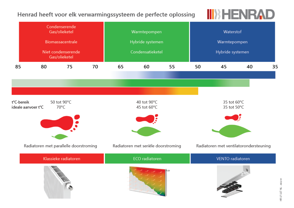 Kiest u voor een hybride warmtepomp dan is de Henrad ECO een uitstekende keuze. Hierdoor kan men de aanvoertemperatuur terugbrengen tot in het bereik van 45 – 55 ° C. Uw grote voordeel is niet alleen een besparing op uw energiefactuur, maar bovendien behoudt u, dankzij de tot 100% hogere stralingswarmte, uw comfortgevoel. Bij de ECO radiatoren wordt het water op een unieke manier door de radiator geleid. Eenmaal gekozen voor de ECO radiator is uw installatie geschikt voor zowel hoge- als lage-temperatuursystemen.