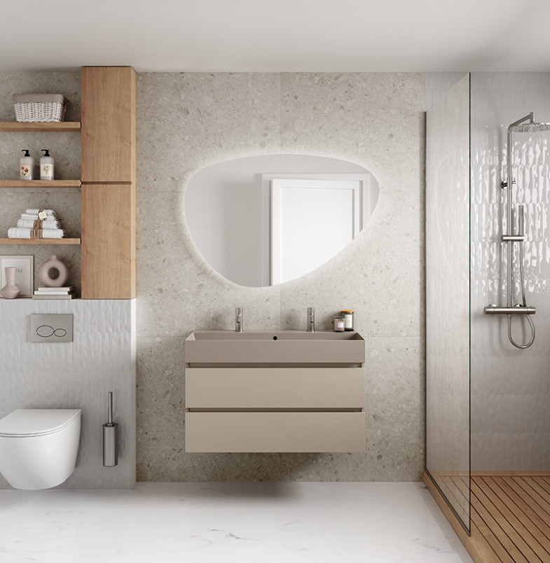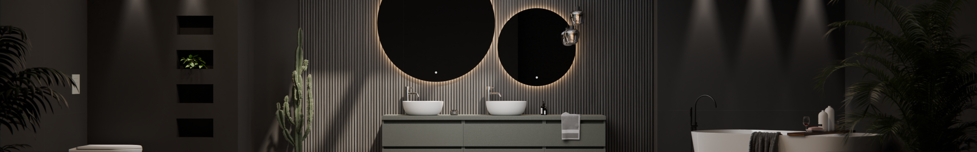 Spiegels en spiegelkasten: In verschillende vormen en afmetingen, voorzien van LED-verlichting, halogeenverlichting of TL-verlichting, eventueel voorzien van spiegelverwarming. Spiegelkasten, verkrijgbaar in alle denkbare dieptes, kunnen zowel enkelzijdig als dubbelzijdig gespiegeld worden uitgevoerd.